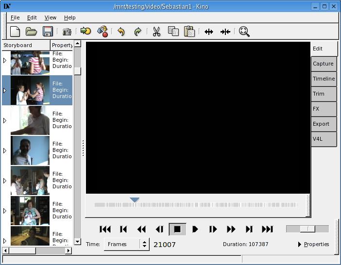 Kino's interface is clean and easy to navigate (Figure 4). To the right of the main window, tabs indicate the various functions, from capturing to editing to exporting the finished product. The Edit tab is where most of the work happens (after the Capture, of course). This is where you cut or join scenes, or even insert additional files in to your video project. The Timeline tab breaks up the current scene (and video clip) into multiple frames, so you can jump to any part of the video without having to play the whole thing.