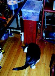 The cat feeder is open for business. Occasionally, a treat jams up the works, but 95% of the time, the cats get a stinky little fish. We already have plans for cat feeder v.2.0. We'd love to add a Webcam to see the kittens during the day, as well as move the device to a wireless laptop in the kitchen. The feeder is, as with most of our projects, a work in progress. Feel free to go to the Web site and give Cotton and Tulip a treat.