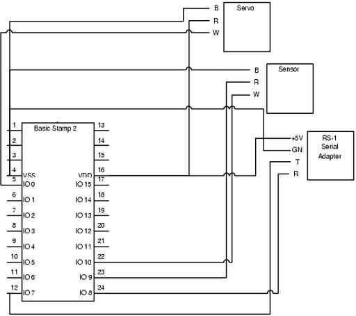 The BASIC Stamp has 16 I/O pins. Each pin is set to high, +5V, or low, 0V, based on programs you create. Say you want to make an LED blink. You attach one end to an I/O pin and the other to a ground pin. You write a program that says, every second, turn the I/O pin to high (on), wait for a second, then turn it to low (off). Now replace the LED with a servo, and we've got the start of the cat feeder.