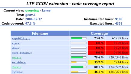 Also, because the kernel is not linked with standard C libraries, many of the GCOV structures are not present in the kernel. The LTP has published a GCOV-kernel patch to the Linux kernel that addresses these issues and allows developers to use the existing GCOV tools to gather coverage data from a running kernel. Installation instructions as well as a detailed description of the functionality provided by the patch can be found at the LTP Web site and in an Ottawa Linux Symposium paper by Paul Larson and others.