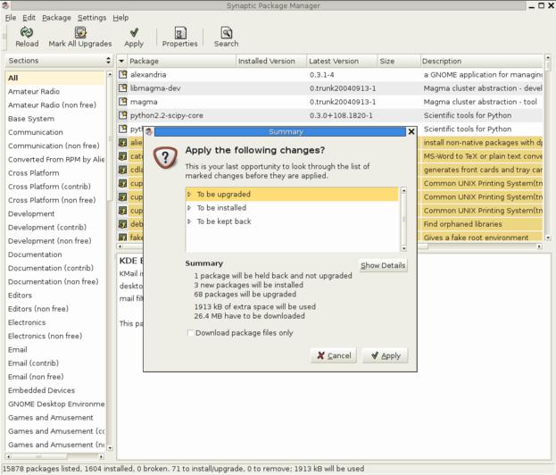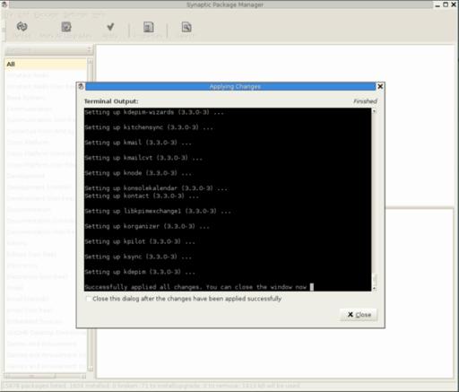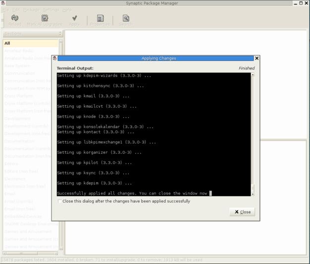To download and install all package updates, click the Apply button. You then are prompted with a window detailing which packages will be upgraded, installed, kept back or removed (Figure 1). Kept back means that the package would require other dependencies that were not stated specifically. Clicking Apply begins downloading the updates. Following the download process, the updates will install in a terminal-like text box, allowing you to answer questions if needed. When finished, click the Close button (Figure 2).