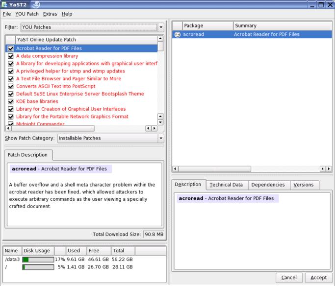 SuSE 9.1 has a similar method for installing updates by using the YaST2 Online Update (YOU) GUI tool. You can find this by clicking on the SuSE icon, then System→YaST. After entering your root password, click on Software and then Online Update. You can choose your installation source or add a new server manually (Figure 4). Additionally, you can configure YOU to download and/or install updates automatically at a specified time each day. Clicking Next downloads information that tells you what packages need to be updated. After this list is updated, we are presented with the list of packages, a patch description and disk usage (Figure 5). In the list of patches, red lines denote security updates, blue lines denote recommended updates and black lines are optional updates. To perform the upgrade, click Accept. After the updates are completed, click Finish, which configures a few system services. In addition to the YOU system, you can use the rpm command from the command line.