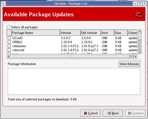 In the Channels menu, you can subscribe to two channels or repositories where updates are kept, fedora-core-2 and updates-released-fc2. Channels in up2date are similar to the repository in APT or urpmi. You are asked to note any packages you want to skip. The package already listed for me was a kernel upgrade. Clicking Forward gives you a list of available software updates (Figure 6). To select all updates, click the check box next to Select all packages.