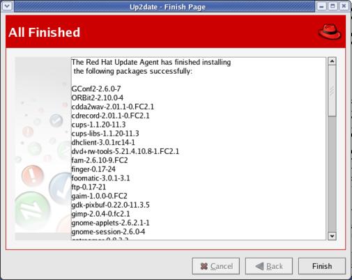 The Red Hat Update Agent, up2date, has been around for several Red Hat versions and is present in Fedora Core 2. To check for new software updates in Fedora Core 2, right-click on the red exclamation point in the system tray and choose Check for updates. To download and install the latest updates, right-click on the red exclamation point and choose Launch up2date. You can choose the defaults. The first time you run up2date, you are asked whether you want to install the Red Hat GPG key signature. I chose yes on my system.