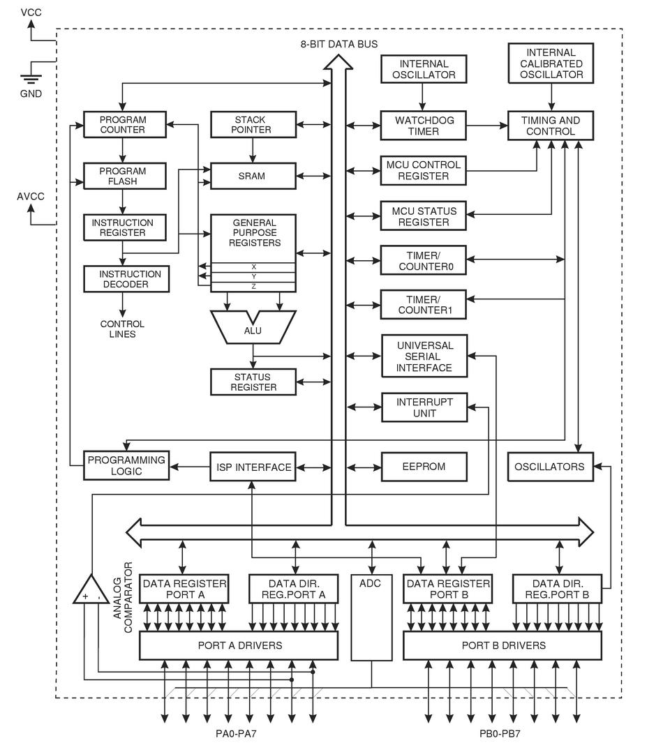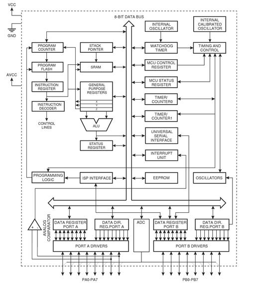 The AVRs are 8-bit RISC platforms with a Harvard architecture (program and data memory are separate). Figure 1 details the ATtiny26 AVR chip internal organization. Like each member of a family, it has its own particular combination of I/O and peripherals, but it shares a basic architecture and instruction set with all the other AVRs. The ATtiny26 has 2KB of program Flash memory, 128 bytes of onboard SRAM and EEPROM, two 8-bit counters and pulse-width modulators, 11 interrupts, 16 I/O pins spread over two 8-bit ports, an 11-channel 10-bit analog-to-digital converter and more—all on a single tiny 20-pin DIP.