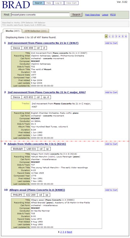 would return anything with Mozart in the composer (cp) field and piano in any field. We decided to retain this syntax in BRAD so that power users still could do the kinds of searches they were used to doing. We had planned to add an advanced search page for BRAD; however, this syntax has turned out to be so flexible that we haven't needed it.