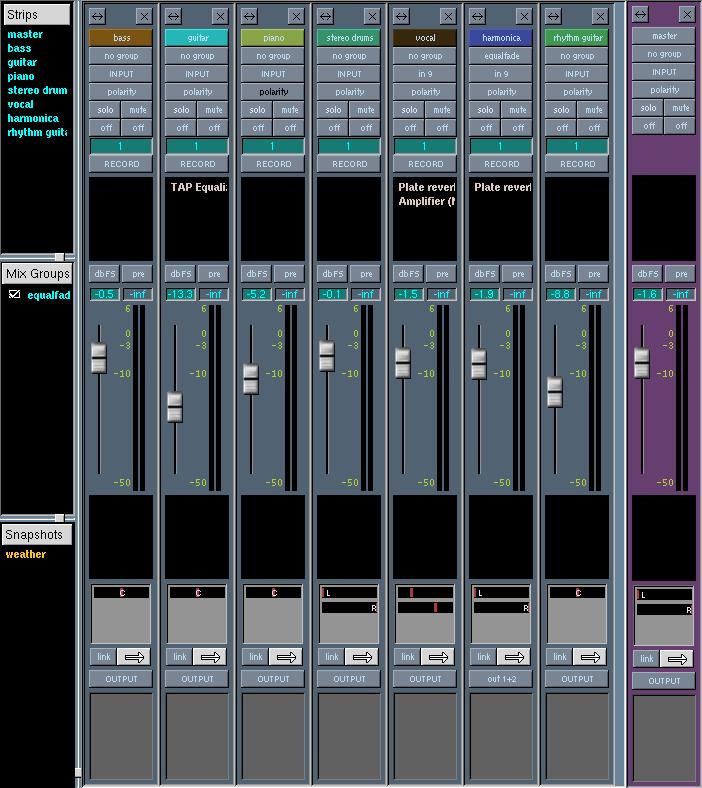 When I was happy with the recorded performances, I started working on the mix. Many aspects of the raw mix were in need of attention: the rhythm guitar track needed a volume fade-out at the end and equalization (EQ) throughout, the MIDI instruments weren't bright enough in the mix and everything needed to be normalized and balanced. Fortunately, Ardour handled these tasks with the greatest of ease. I used LADSPA plugins for equalization and amplification, and I employed Ardour's own internal normalization routine when it was needed. I also added reverb to the vocal and harmonica parts, again by using a LADSPA plugin.