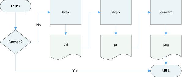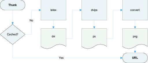 The rendering system takes a string of text and extracts segments enclosed in [tex] and [/tex] pairs for future substitution. These extracted segments are called thunks. If a thunk previously has been processed, meaning an image representation of the thunk code already is available, the thunk is replaced with a URL to that image. If the thunk is new, it is passed to the LaTeX typesetter, which outputs its result as a DVI file. The DVI file then is converted to a PNG image with ImageMagick and placed into the cache directory. A URL of the newly created image is substituted for the thunk in the original text. When all thunks have been processed, the resulting text is returned to the caller. The process for converting a single thunk is illustrated in Figure 1.
