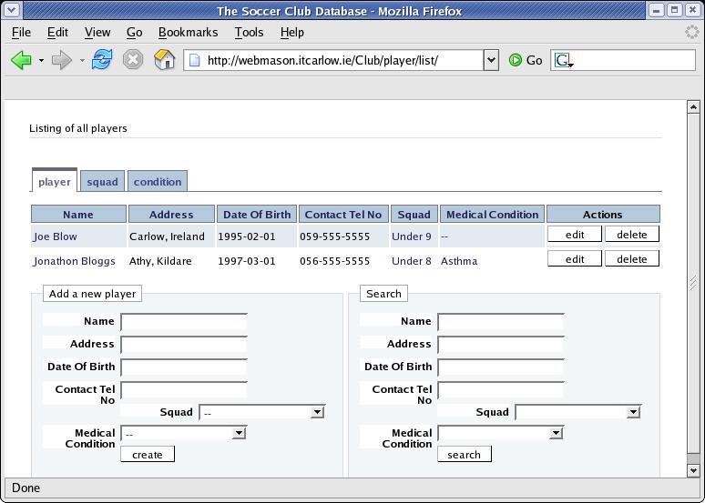 Figure 4 shows the display after the entry of two fictitious players. Notice all the functionality provided for free. Tabs for each of the tables are located along the top of the display. Simply click on the tab to display that table's data. Each row of data has an associated edit and delete button. Click on any column heading to sort the display on the data in that column. Perform a search using the provided search form. Add more players using the add form. Notice the drop-down menus for the player's squad and medical condition. Click on the field and a drop-down box appears with the choices available to you. This bit of magic occurs because Maypole has been told that each player “has a” squad and “has a” condition. By default, Maypole uses the name data column in the referred to table to provide the data to these drop-down boxes.