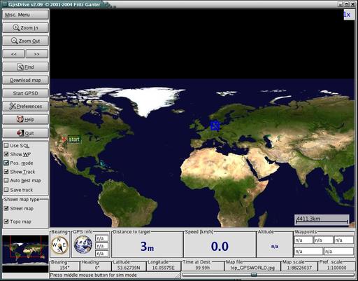 Once you have GpsDrive and any optional software you want installed, and you know the GPS receiver is working, try GpsDrive. You will see a splash screen, then the main window. Then you will see one nag screen for the first and last time. The author, Fritz Ganter, pays for the server for the Web page out of his own pocket and would appreciate your contribution.