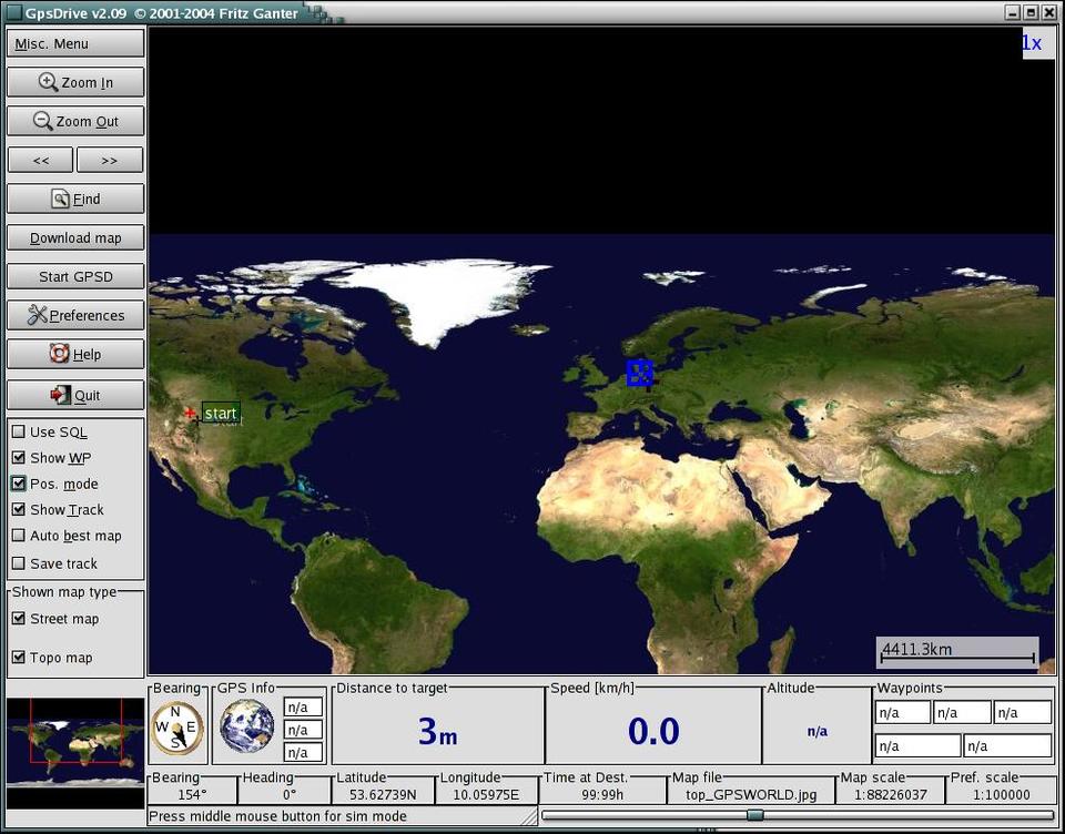 Use position mode to move around on your maps. Enter position mode by checking Pos. mode on the lower-left side of the main window. Once you are in position mode, as you jump around by clicking on the map, GpsDrive shows you the distance and bearing from the current position (marked with a blue square) to the target (indicated by an alternating red and blue cross).