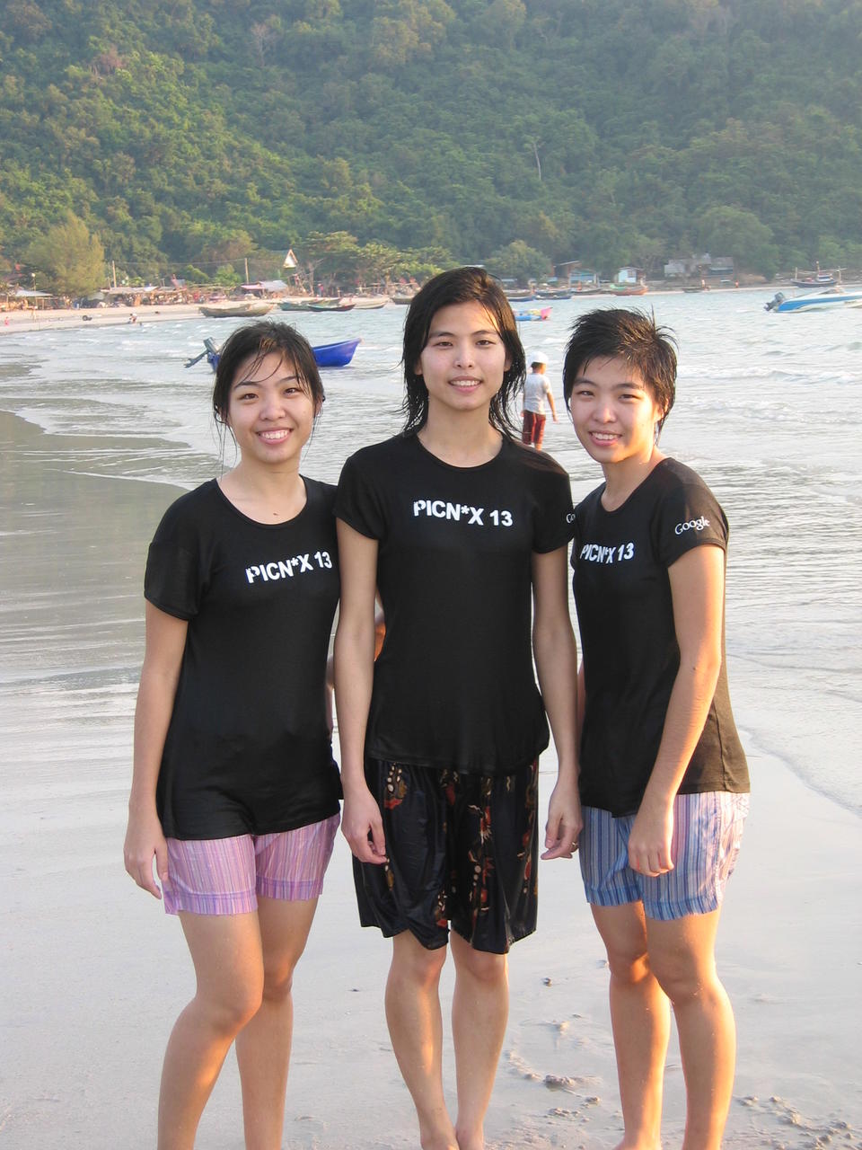 I took this picture of my wife, Ja (center), and her two twin sisters, Apple (left) and Cherry (right), on Christmas Day 2004, in Rayong Thailand. The T-shirts were from the Picn*x 13 Linux picnic in Sunnyvale, California last August (donated by Google).