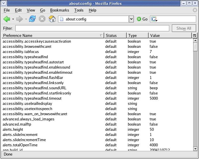 The Firefox Web browser, built by the Mozilla Foundation and friends is a complicated piece of technology—if you care to look under the hood. It's not obvious where the hood catch is, because the surface of Firefox (its user interface) is polished up to appeal to ordinary, nontechnical end users. This article gives you a glimpse of the engine. It explains how the Mozilla about:config URL opens up a world of obscure preferences that can be used to tweak the default setup. They're an improbable collection and therein lies the beauty of Firefox if you're a grease monkey or otherwise technical. At the end you'll know a little more about Firefox, but only enough to be dangerous.