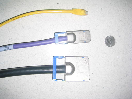 Figure 1. Top to Bottom: cat5 Ethernet Cable, 4X InfiniBand Cable and 12X InfiniBand Cable (US quarter coin included for scale)