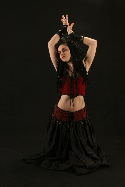 Tempest embodies the look and attitude of the new generation of dancers who infuse traditional belly dance style with a modern edge. Her signature style and Goth sensibilities are reflected in her highly personal costume style, which easily could be worn in a variety of venues from nightclubs to Renaissance fairs to belly dance festivals.