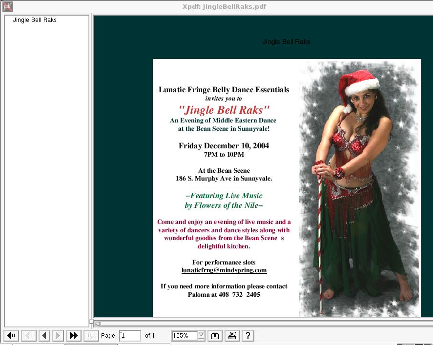 Our second example solved a problem in belly dance promotion where pre-existing marketing content had to be used. With photos we'd taken at an earlier photo shoot, Paloma created a Web poster for a belly dance event held in December 2004, called Jingle Bell Raks. We now needed to create a print poster plus a separate high-resolution electronic distribution format. Free software made it possible to support Paloma's marketing concerns where “...obstacles include venues to advertise at low cost. Finding the right bulletin boards to post on to be most effective. Also finding new avenues of distribution to reach outside the Belly Dance Community, to draw in the general public.”