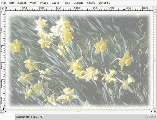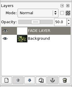 The GIMP has powerful layer manipulation capabilities, and we needed only a few of them to accomplish a lot. In Figure 4 we added a layer filled with all-white color and merged this at 50% opacity to create the slightly faded flower field image. The resulting picture is shown in Figure 5.