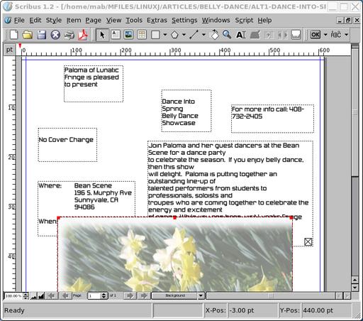 To create a new poster for a Spring-themed belly dance event, we held a photo shoot and then edited the studio photos with gthumb and The GIMP. These resulting images were combined with other text and photo elements to create the poster. The poster itself was done on Linux using a desktop publishing (DTP) application called Scribus. Refer to Clay Dowling's article “Linux as a Publishing Platform” on the Linux Journal Web site for more details on using Scribus and The GIMP to publish on Linux. Although we describe only some of the big steps we used with The GIMP and Scribus, we were surprised at how easy it was to use this powerful application to position graphic elements precisely and ultimately obtain a professional result.