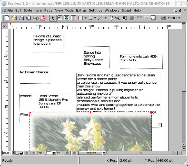 After text placement and coloring, we added two additional photos from live belly dance events, with Simone and Tempest at the bottom. The photograph of the single daffodil was placed in the upper right, near the poster title. With the final edits complete, the bright and engaging poster is shown in Figure 8. Using Scribus, one source document could be used simultaneously for both print applications and as an on-line PDF file for Internet distribution to the public.