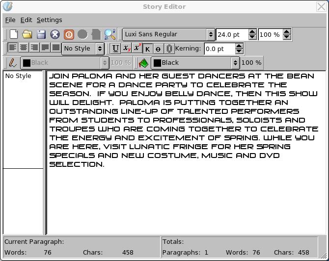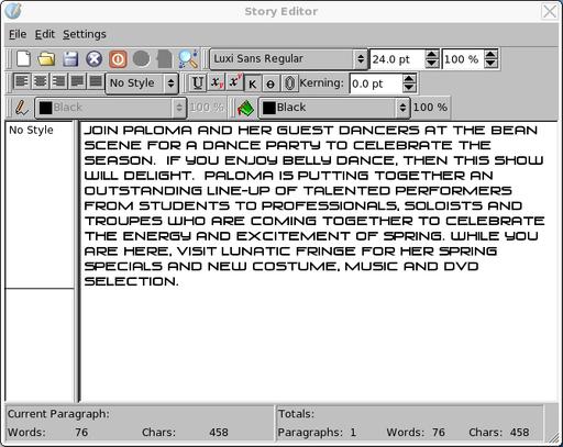 To assemble all of the graphical elements, we started Scribus. The easiest thing to do was to place the text onto the letter-sized layout view in separate chunks, along with graphical items. These could be changed and placed using Scribus tools. An early version of the poster layout is shown in Figure 6. We used the Scribus editing panel for changing the original ASCII text, which imported with a default font, into something different and more appropriately sized for the poster (Figure 7). Other text bodies were handled similarly. This work included colorizing the text, changing the line layout and other typographic qualities.