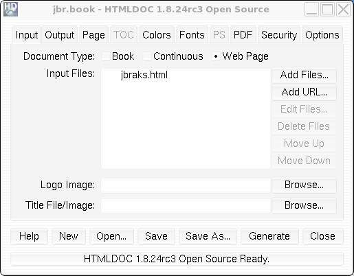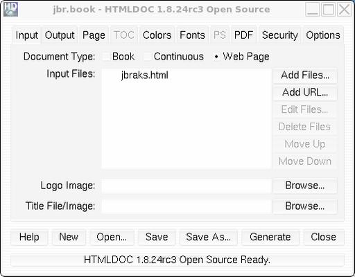 A high-quality print-oriented conversion program called HTMLDOC (see Resources) came to the rescue here in an unusual application of free software. The robust HTMLDOC program can be compiled from source with ease. What is does is amazing: it reads in HTML, images and other data and then automatically turns that content into PDF files or PostScript as output. It also has powerful book-production and indexing features. Our case was pretty simple, we wanted to create a one-page print poster and PDF file automatically. It was really easy to do, as shown in Figure 9. We simply inserted the name of a single HTML file via the HTMLDOC GUI and then configured the program to make PDF files. The resulting poster as shown with xpdf is depicted in Figure 10.