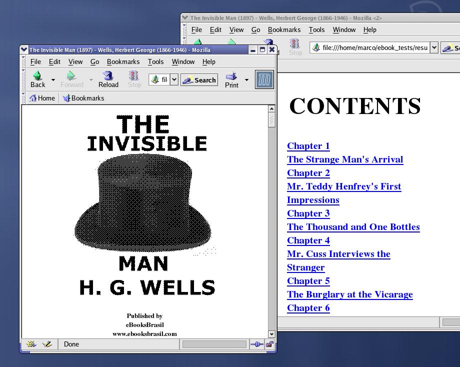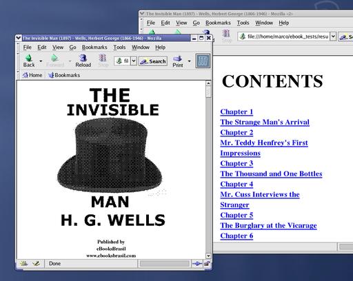 The Rbmake tools should compile quickly and without problems on any modern GNU/Linux distribution. Exhaustive HTML documentation also is included in the source tarball. The binary file able to generate HTML files is called rbburst. It extracts all the components—text, images and an info file—present in the original .rb container. Figure 2 shows, in two separate Mozilla Windows, the cover page and the table of contents of the file generated by rbburst when run on The Invisible Man by H. G. Wells.