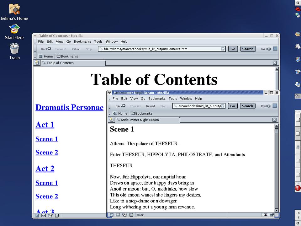 Pyrite can be enough if all you want to do is quickly index a digital library. On the other hand, it is almost trivial to reformat the result to make it more readable in a browser. The snippet of Perl code in Listing 1, albeit ugly, was all it took to produce the version of Don Quixote shown in Figure 1.
