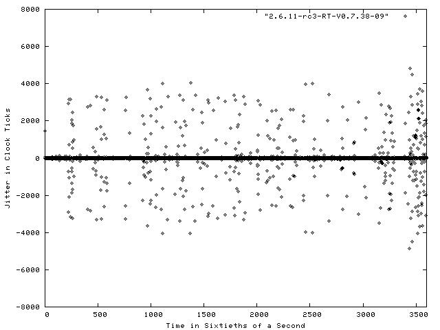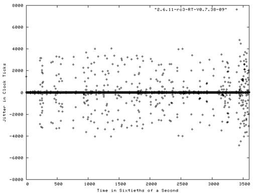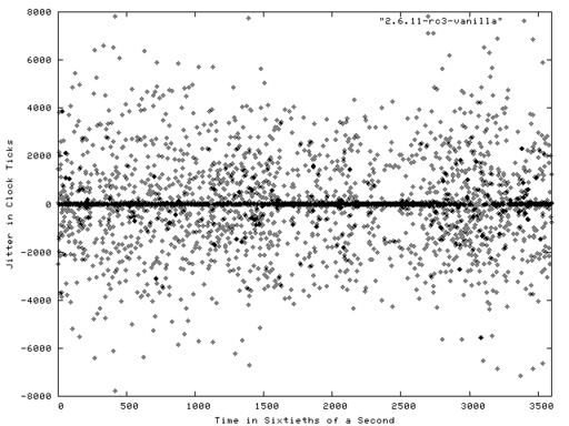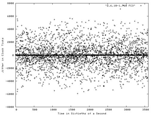 Figure 1 shows a plot of the results of the Realfeel benchmark run on a stock Fedora Core system for a period of one minute. The system was running kernel version 2.6.10-1.760_FC3, which is a 2.6.10 kernel with various patches and enhancements applied by Red Hat. Each dot in the figure represents the jitter between an interrupt request and its handling. The X axis is the sample time in 1/60 of a second. Negative jitter numbers are displayed when the system responded to the interrupt faster than the projected standard time. As you can see from the figure, a fair number of these interrupt requests were handled exactly as expected, resulting in a visibly dark line along the 0 value of the Y axis.