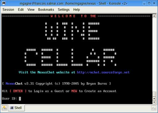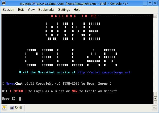 Switch to your NexusChat directory and prime the user database with userdb -z -s 999. Aside from prepping the database, you need to create the 000 user with a password of root. To start the server, which runs on port 4000 by default, simply type /path_to/nchat. Now, from another terminal, connect to your chat server and log in as 000: