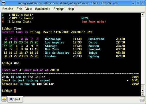 To change to the BBS equivalent of the superuser, or root, press the $ hot key. In this case, the superuser is known as the SysOp, or system operator. Only the person with his or her handle in the etc/su_passwd file has this hot key at his or her disposal. In all other cases, a nice calendar is displayed showing times in various worldwide locations. Once you are SysOp, you have access to a number of additional commands; simply press Ctrl-S to enter the SysOP menu. Once you are the SysOp, you have the option of configuring various system parameters, creating rooms (message as well as live chat rooms) and dealing with pesky users if need be.