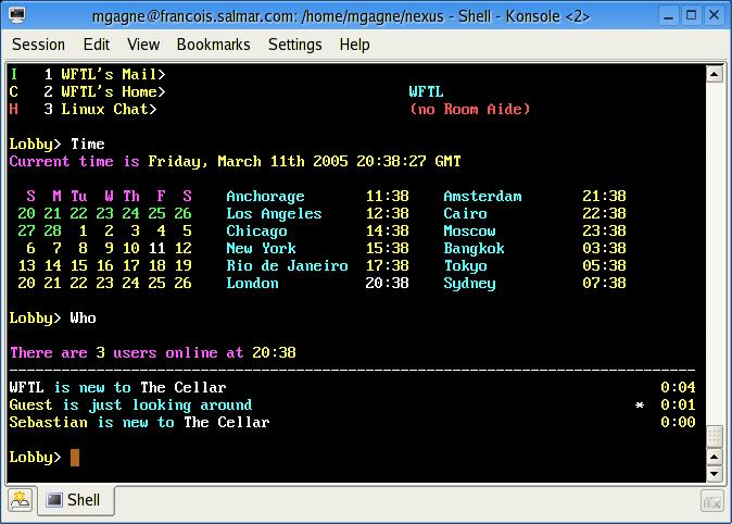 While François refills your glasses, let's look at another example of the venerable BBS. Some programs offer more sophisticated features than NexusChat does, such as full message facilities, complex room creation—some for messaging, others just for chatting—statistical information, world clocks and calendars and more. One such BBS is Walter de Jong's bbs100.