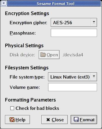 Figure 5. GnomeSesameFormat gives you an easy-to-use front end for setting up and using encrypted disk partitions.