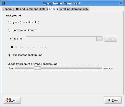 Use the slider to adjust the level of transparency and then close the profile dialog. Now, start the GNOME terminal like this: