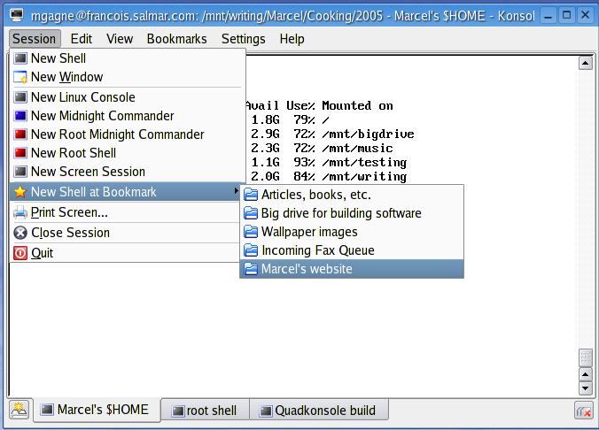 In the KDE world, there's Konsole, which also handles tabs nicely. To start a tabbed Konsole session, click Session on the menu bar and select New Shell. Then, customize the tabs by double-clicking on them and giving them a name. When you are running multiple shells—a compile here, a monitor session there and a root shell in yet another tab—naming your tabs makes a lot of sense. Also notice that when you click the Session menu, several options are available, including starting a session in a bookmarked location (Figure 4).