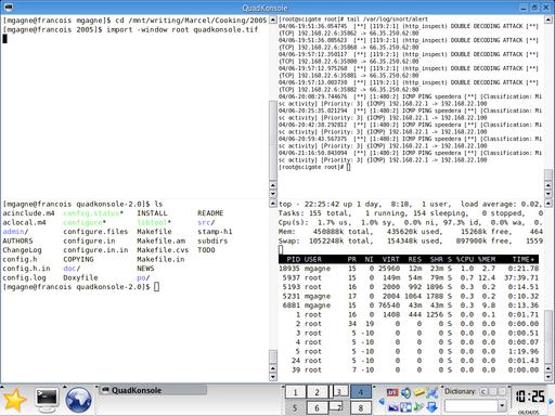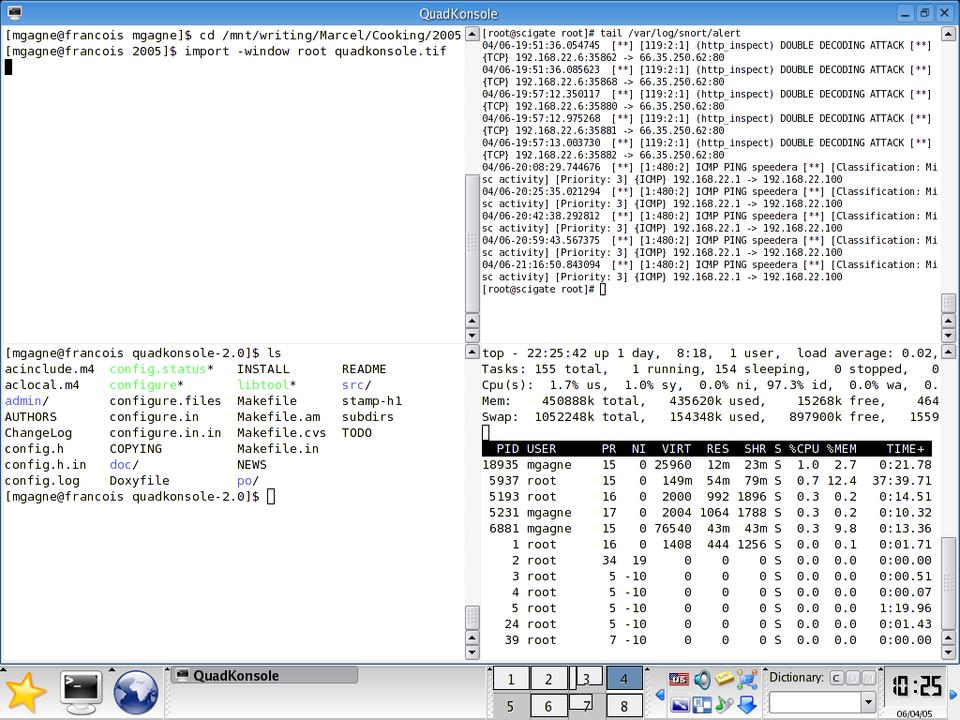 The final selection on tonight's menu is something so great, I'm frankly amazed I hadn't seen anything like it before. I decided it was great, because I started using it regularly as soon as I discovered it. Using KDE kparts, Simon Perreault created a program called Quadkonsole. As the name implies, it starts up four Konsole programs in a grid (Figure 5). There's no need to line up your Konsoles side by side or click from one shell tab to the next. To make things even nicer, the Quadkonsole creates only one task in the task bar, leaving your Kicker panel uncluttered. That feature is going to be particularly useful as I tell you more about this great terminal program.