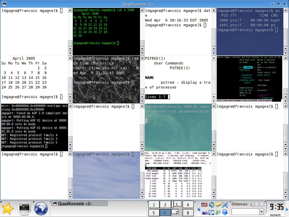 This command starts up Quadkonsole with 16 individual terminal sessions (Figure 6). That's why having only one instance in your Kicker panel is such a nice feature. This also might be a good time to start playing with the font size if you want the information to fit. In one of my sessions, I have top, the real-time process and resource monitor, running with a super-tiny font. Of course, now I need to run a desktop magnifier such as kmag in order to see it.
