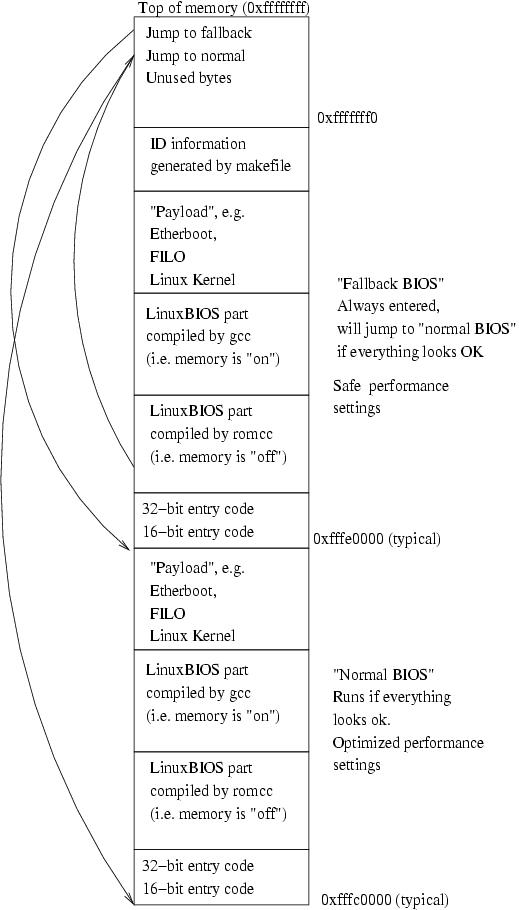 The layout of a typical ROM image is shown in Figure 2. The top 16 bytes contain two jump vectors, a jump to the fallback and a jump to the normal. LinuxBIOS always jumps to the fallback first. If all is well, it jumps back to the jump to normal vector at the top of memory, and from there to the normal image. If the fallback code detects problems or if the CMOS settings indicate that fallback BIOS should be run, the fallback BIOS runs.