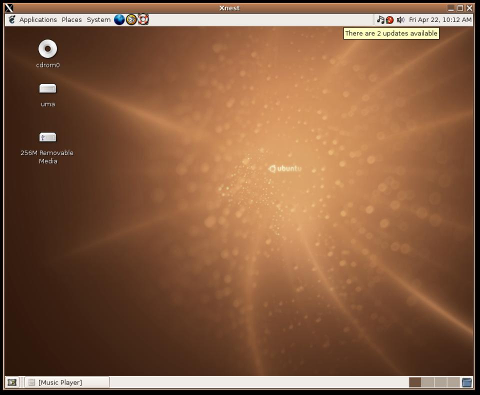 Figure 1. The GNOME desktop with a CD-ROM, a server called uma and a USB Flash drive all mounted. Music is playing. An update is available (red icon, upper right).