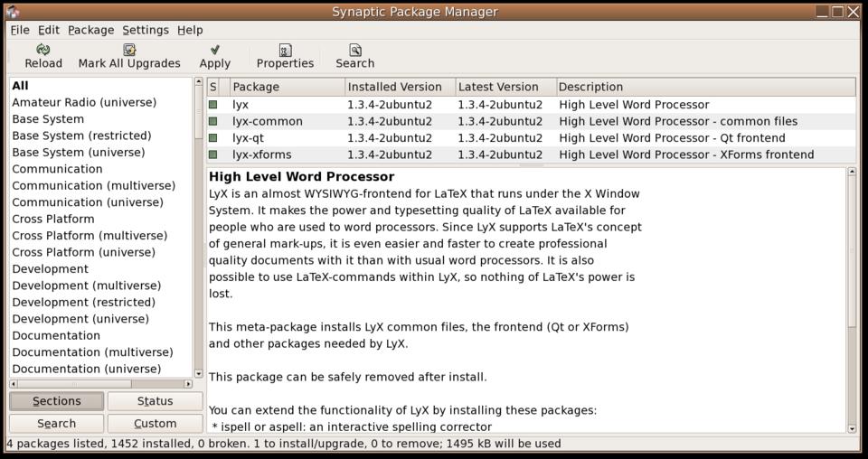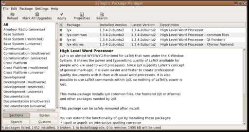 Using the apt-get command-line tool, it also is possible to update your system, automatically retrieving any new versions of the packages you already have. There is also an ncurses-based character-mode tool called aptitude that makes it easy to browse packages, plus a GNOME graphical package browser called Synaptic Package Manager. All of these have been standard in Ubuntu since the first release.