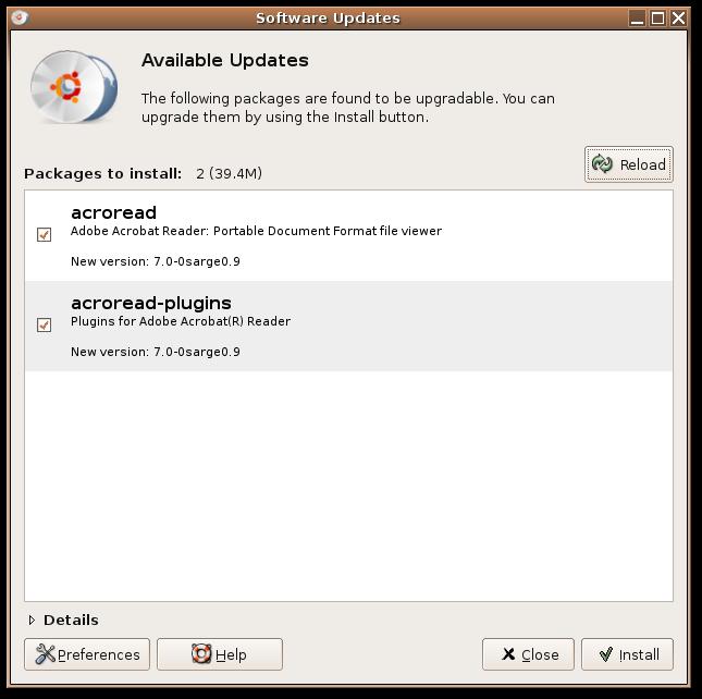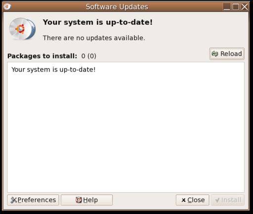With the 5.04 release, Ubuntu has made package management even easier, and the most common cases are now extremely simple and discoverable. When updated packages become available, a bright red icon appears in the notification area. Clicking on the icon launches the Ubuntu Update Manager, which shows a list of packages with available updates; one click on the Install button updates the Ubuntu system to the latest packages. This handles both security updates and feature updates.