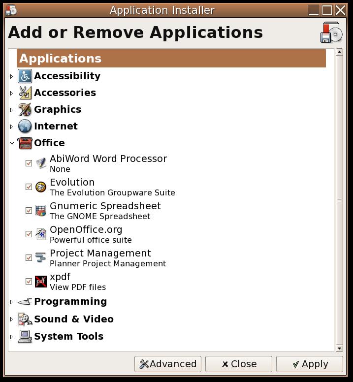 Under Applications/System Tools there is a launcher for the Add/Remove Programs dialog, another new feature to Ubuntu 5.04. The most common programs a user might want appear here, along with an icon, a friendly name and a terse explanation of what the program does. Simply marking a check box next to the program name selects that program for installation. Clicking on the Advanced button brings up the Synaptic Package Manager, which can perform any package management task. Expert users probably will go straight to Synaptic or aptitude, but beginners will appreciate this feature.