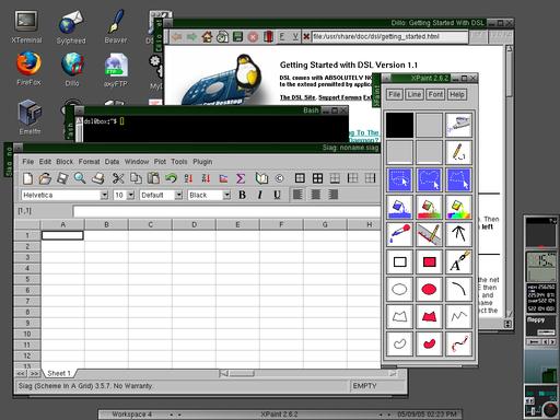 DSL is extremely light and fast. It uses Fluxbox for a window manager. You can run it on modest hardware with very little memory—as little as 16MB. DSL comes with a number of desktop applications, all of which are designed to be equally light and fast. There are Dillo and Firefox Web browsers, Sylpheed for e-mail, an instant messaging and IRC client called Naim, XMMS for music, Xpaint for graphical editing and screenshots, FLwriter for word processing, Siag for spreadsheets and a host of others. Check out Figure 1 to see DSL in action.