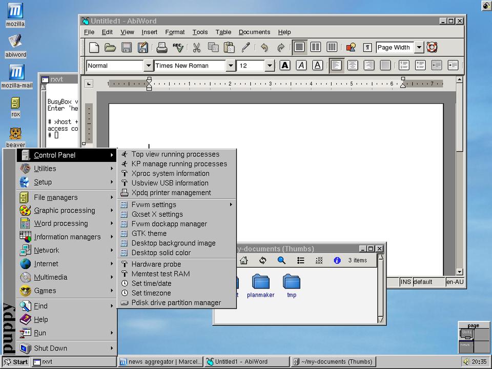 Another tiny graphical Linux you might want to look at is Puppy Linux. This fully networked distribution also comes with a bevy of applications. In terms of networking, Puppy comes with Mozilla for Web browsing as well as sending and receiving e-mail with Sylpheed, SSH for remote administration, Gphone for VoIP calls, VNC and rdesktop clients to control remote desktops and much more. AbiWord is included for word processing, as is the Scribus desktop publishing application. There are file managers, graphic editors, HTML editors, a spreadsheet program, a personal finance application and more.