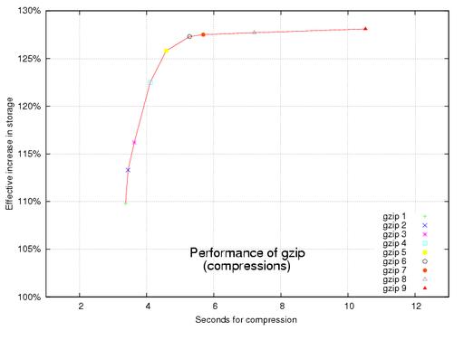 The most popular data compression tool for Linux is gzip, which lets you choose a compression level from one to nine. One is fast, and nine compresses well. Choosing a good trade-off between speed and compression ratio becomes important when it takes hours to handle gigabytes of data. You can get a sense of what your choices are from the graph shown in Figure 1. The fastest choices are on the left, and the highest compressing ones are on the top. The best all-around performers are presented in the graph's upper left-hand corner.