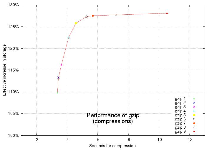 Figure 1. Increasing the compression level in gzip increases both compression ratio and time required to complete.