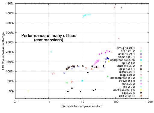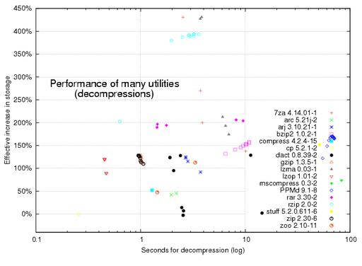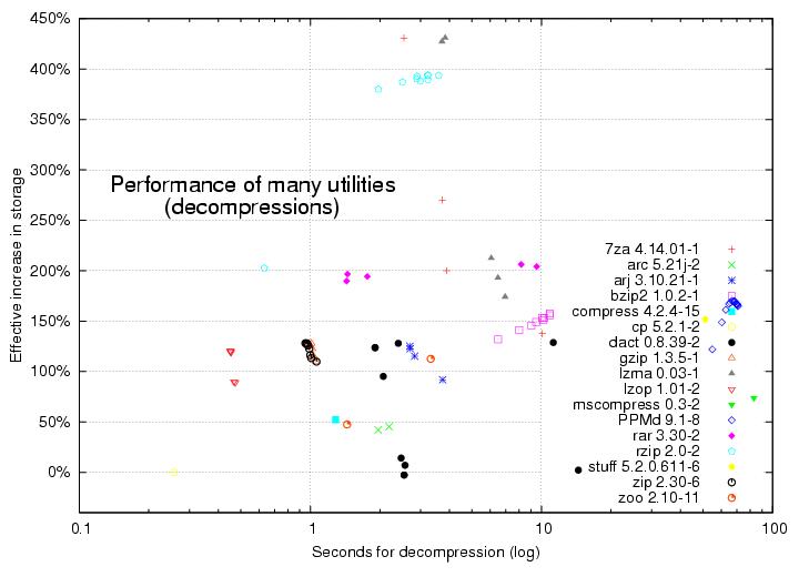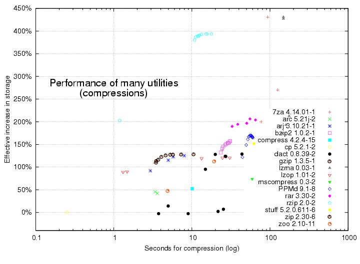 But many other data compression tools are available to choose from in Linux. See the comprehensive compression and decompression benchmarks in Figures 2 and 3. As with gzip, the best performers are in the upper left-hand corner, but these charts' time axes are scaled logarithmically to accommodate huge differences in how fast they work.