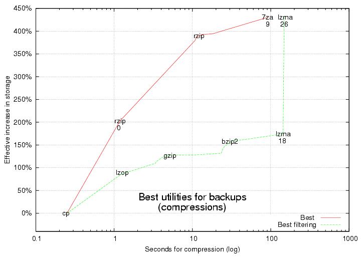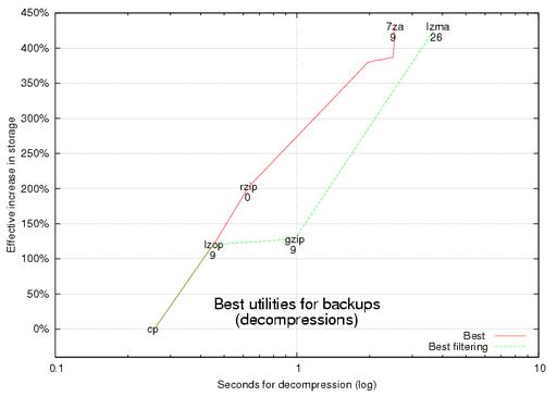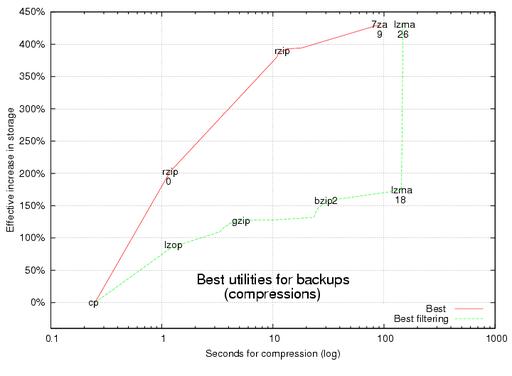 lzop often is the fastest tool. It finishes about three times faster than gzip but still compresses data almost as much. It finishes about a hundred times faster than lzma and 7za. Furthermore, lzop occasionally decompresses data even faster than simply copying it! Use lzop on the command line as a filter with the backup tool named tar: