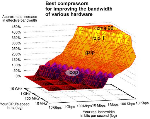 For example, if you have a 56Kbps dial-up modem and a 3GHz CPU, their speeds intersect in the light-yellow region labeled lzma 26 at the top of the graph. This corresponds to using lzma with a 226 size dictionary. The graph predicts a 430% increase in effective bandwidth.