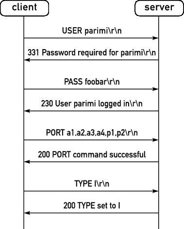 The client program creates a control socket using socket() and next calls connect() to establish a connection with the server. It then creates a separate socket for data transfer using socket() and binds to an unprivileged port (>1024) using bind(). The client now listen()s on this port for data transfer from the server. The server now has enough knowledge to honor a data transfer request from the client. Finally, the client uses accept() to accept connections from the server to send and receive data. For sending and receiving data, the client and server use the write() and read() or sendmsg() and recvmsg() system calls. The client issues close() on all open sockets to tear down its connection to the server. Figure 1 sums it up.