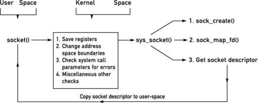 We explain a few issues concerned with writing a network application in the kernel. Refer to Greg Kroah-Hartman's article “Things You Never Should Do in the Kernel” (see the on-line Resources). First, let's examine how a system call in user space completes its task. For example, look at the socket() system call: